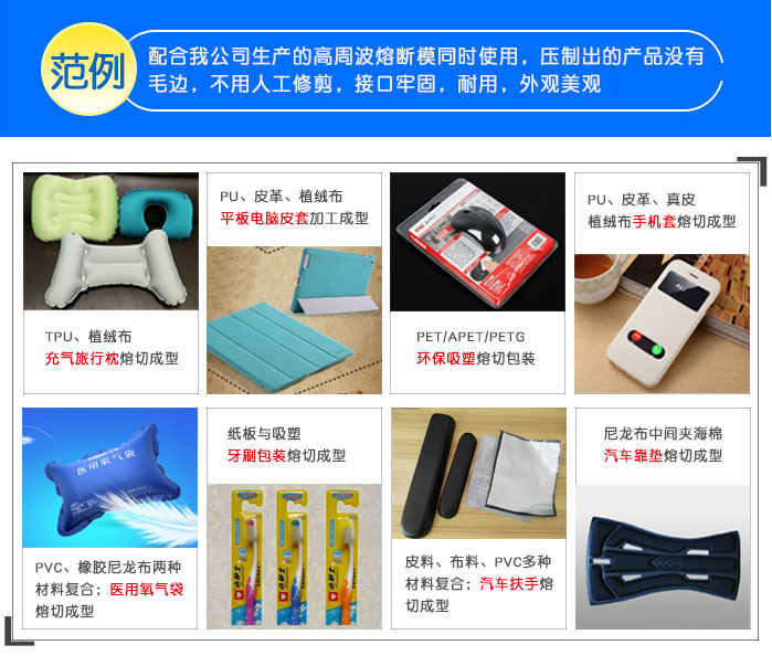 本系列設(shè)備用途相當(dāng)廣泛,除了適用于一般的PVC產(chǎn)品加工熔接,還能解決高周波熔接機(jī)對特殊材質(zhì)難以切邊的難題。配合我公司制作的高周波熔斷模同時使用,可對環(huán)保吸塑進(jìn)行包裝熔切;可制作皮革、植絨布、布夾海棉、PVC夾海棉、尼龍布、TPU、EVA、真皮、PU皮、人造革等材質(zhì)或多種材料復(fù)合的產(chǎn)品,對產(chǎn)品進(jìn)行熱合、熔接同時切除多余邊料,將產(chǎn)品加工成型。壓制出的產(chǎn)品沒有毛邊,邊緣圓滑,不用人工修剪,接口牢固、防水、不漏氣、耐用、產(chǎn)品外觀美觀。